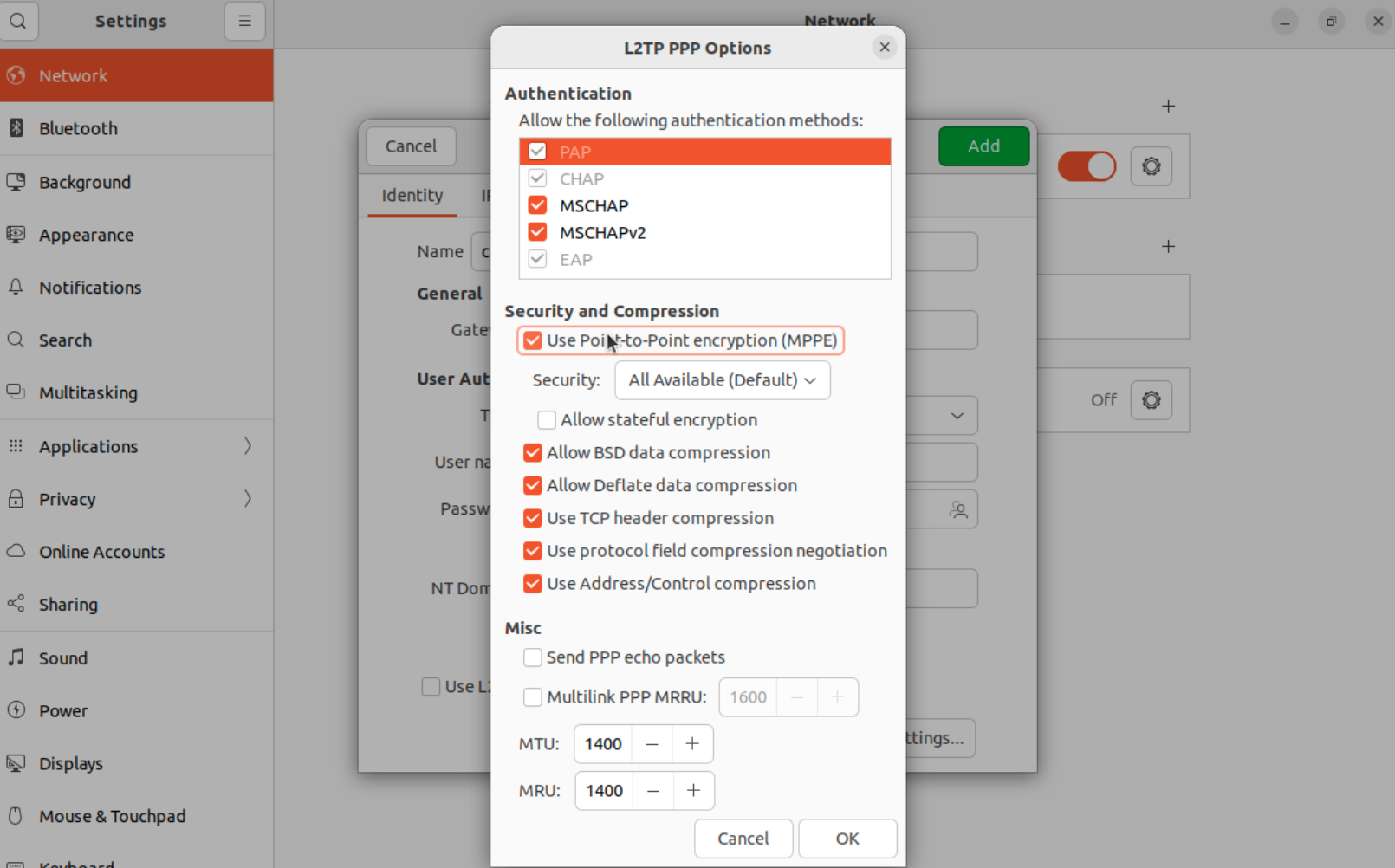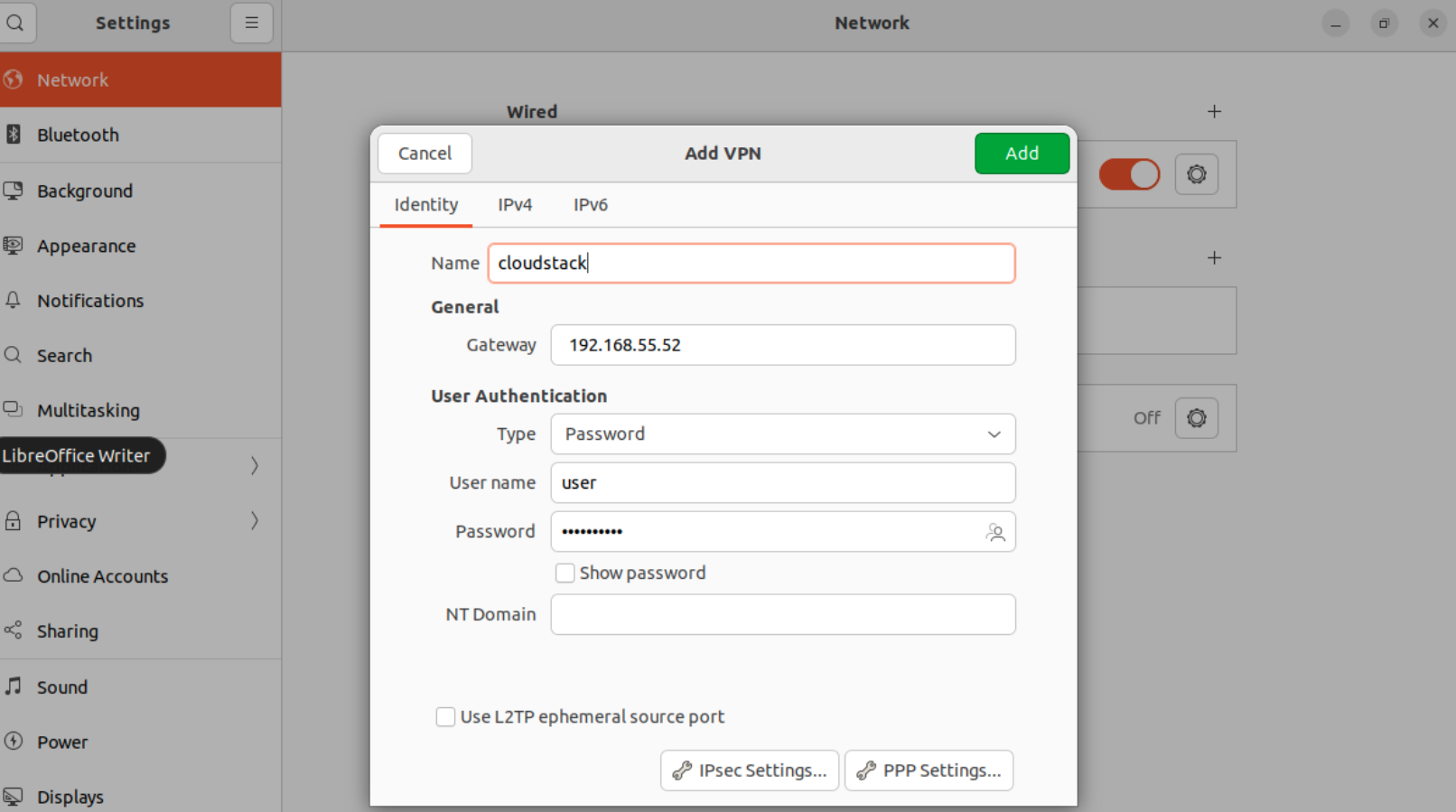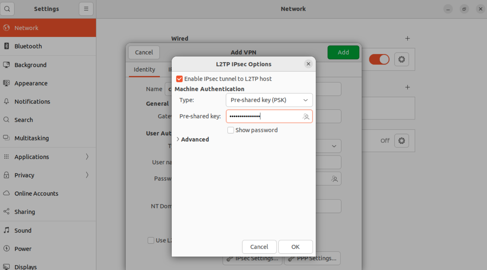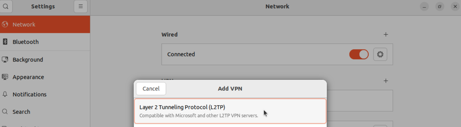 ` add-apt-repository universe apt update apt install network-manager-l2tp-gnome network-manager-l2tp strongswan xl2tpd `Restart Network Manager service to load the new plugins: